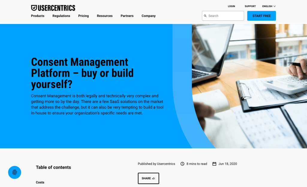 Usercentrics’ consent management solution takes this problem off your hands. It offers an intuitive and robust way to ensure compliance with international privacy regulations and other emerging regulations, such as GDPR, CCPA, LGPD and PSD2. The platform seamlessly integrates with your digital products, and allows you to focus on the core of your product and the UX that delivers your users their experience. Additionally, it features an excellent internal interface for managing compliance effortlessly.